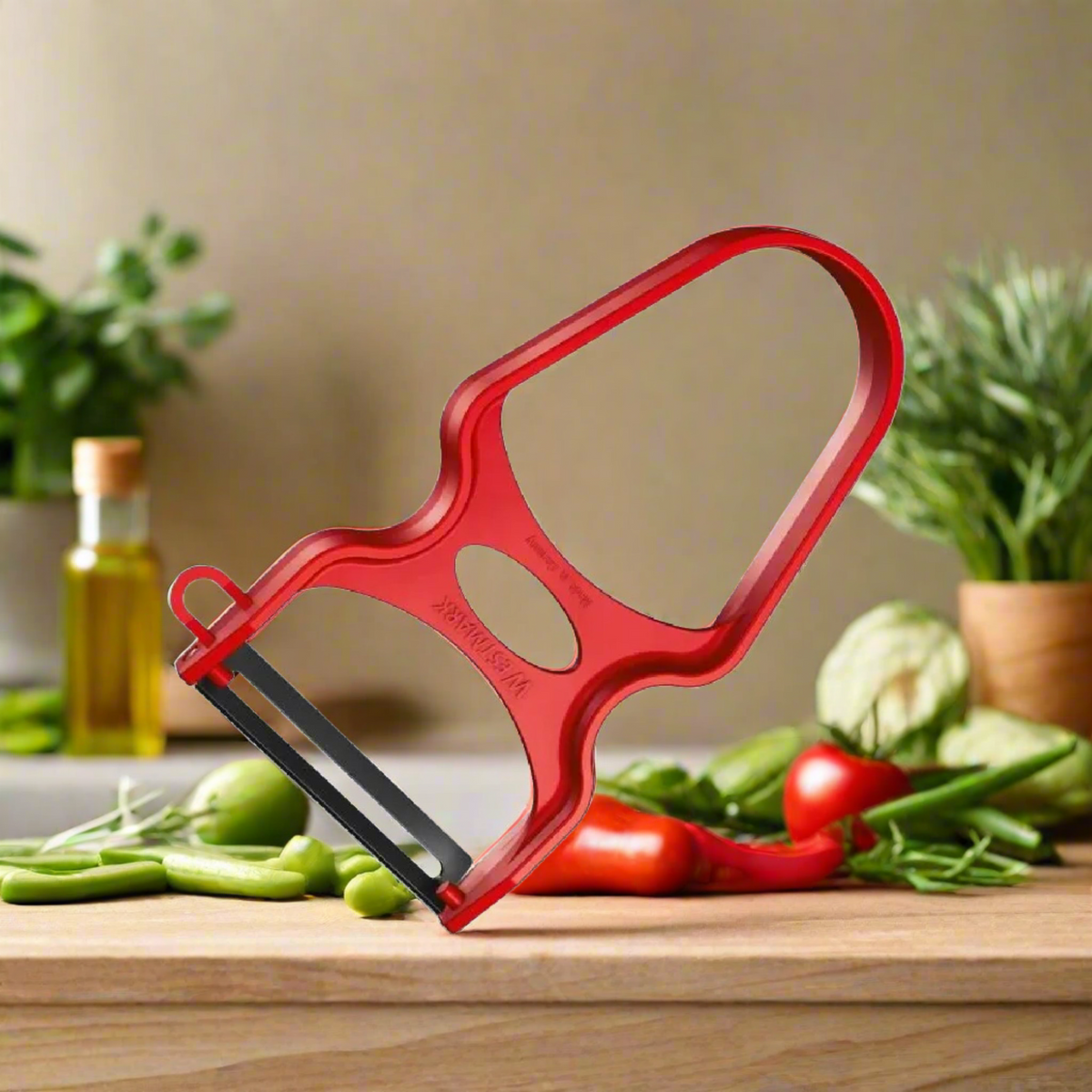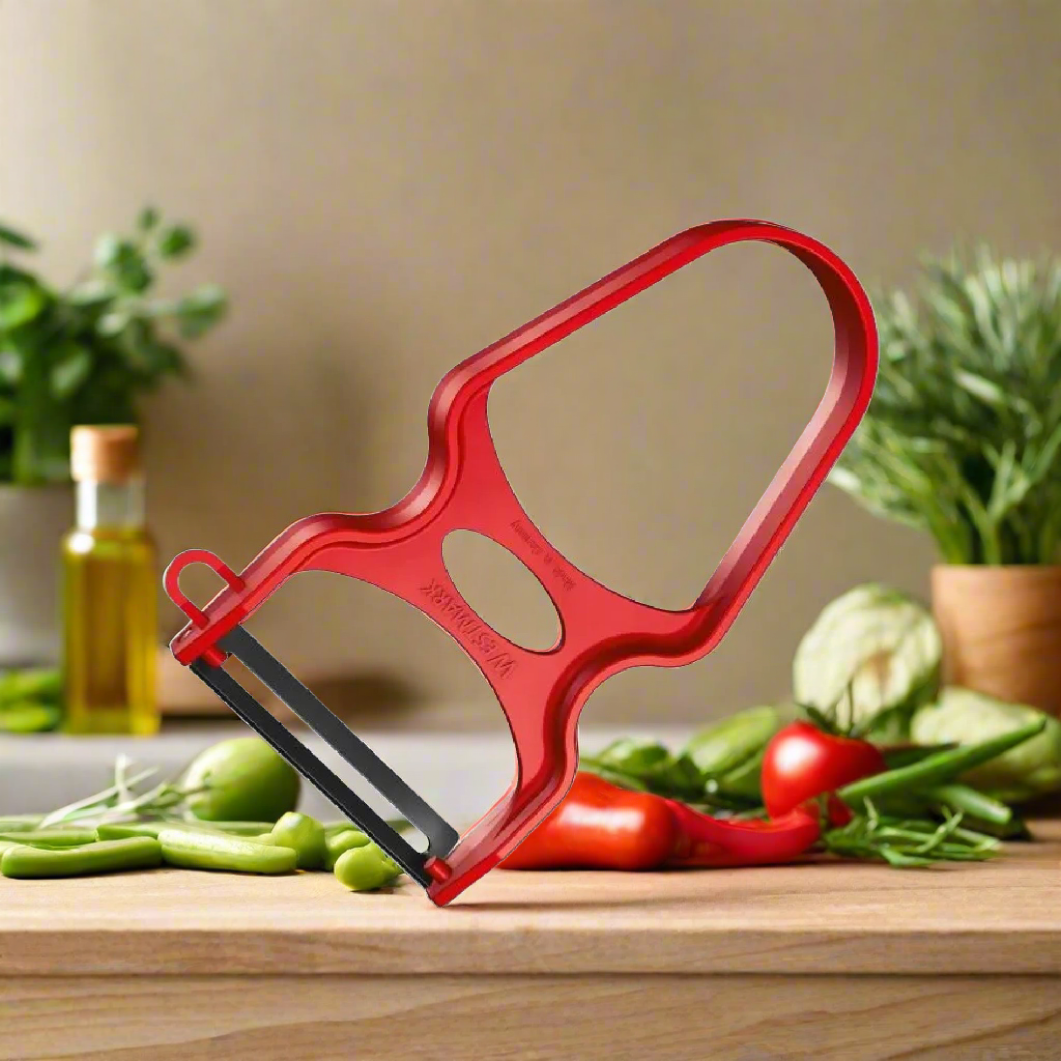 Vegetable and asparagus peeler is the classic U-shaped peeler and the ideal helper in your kitchen. ergonomic handle with finger grips for secure hold, Peeling round or elongated fruit and vegetables such as potatoes, cucumbers, asparagus, apples etc. is done in no time. The pendulum-mounted with the extremely sharp spring steel blade adapts perfectly to the contours of the food and guarantees economical peeling with minimal peeling loss. With the ground cutter, you can quickly and easily remove damaged areas such as the so-called eyes on potatoes.