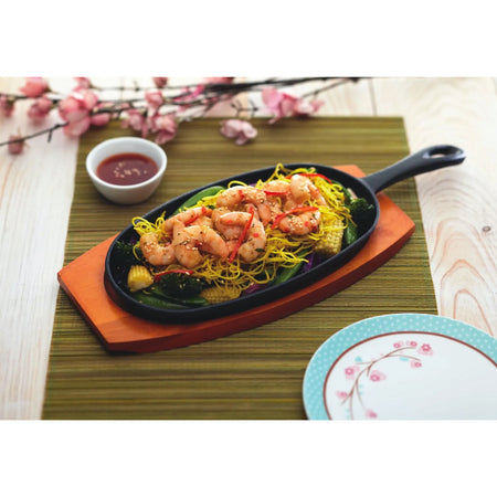 Sample the taste sensations of authentic Oriental cooking with this cast iron sizzle platter. Featuring a protective heat resistant wooden heat stand, ensure that your work surfaces are safe from any risk. Ideal for keeping food warm when serving at the table, the sizzle platter is perfect for introducing friends and family to a true World of Flavours.