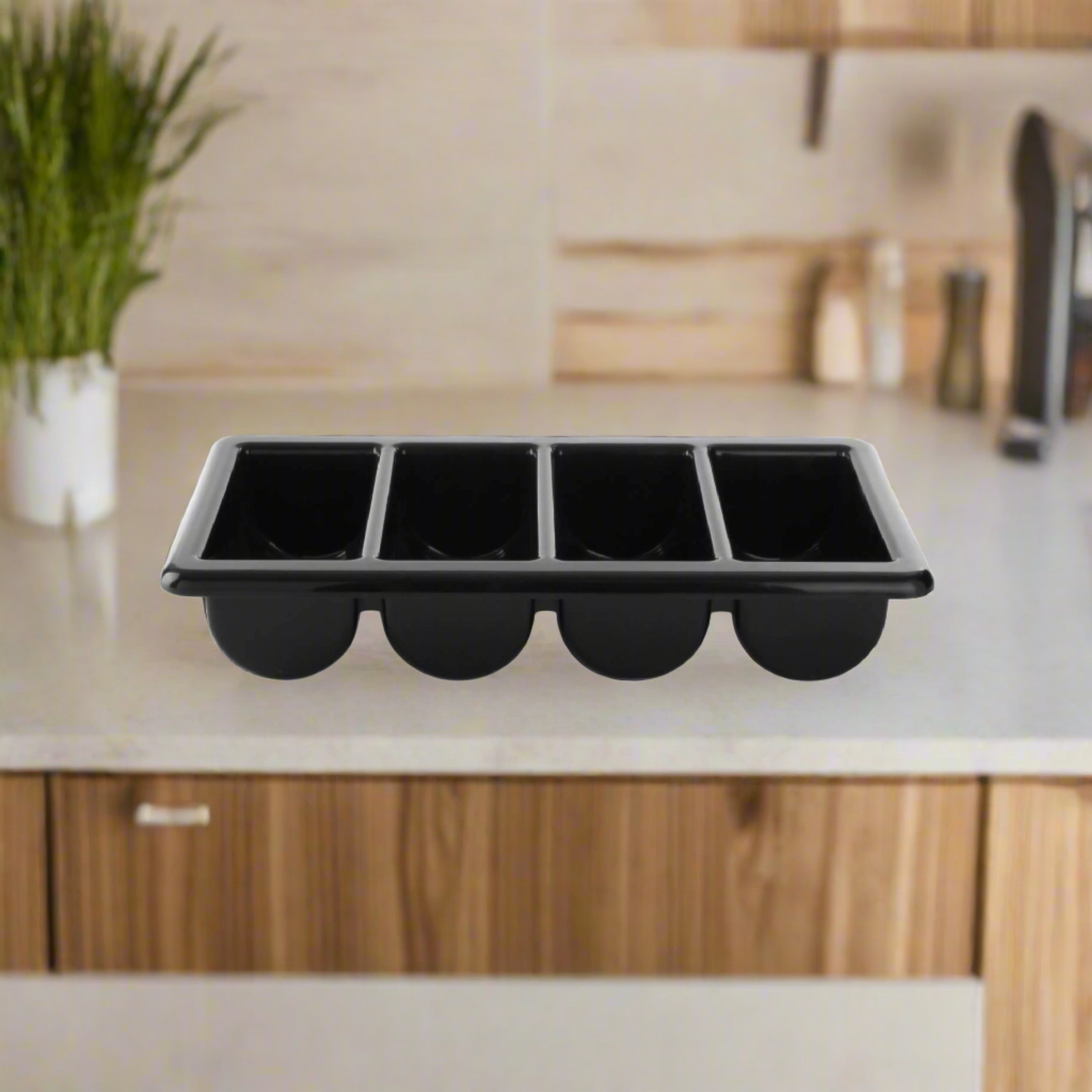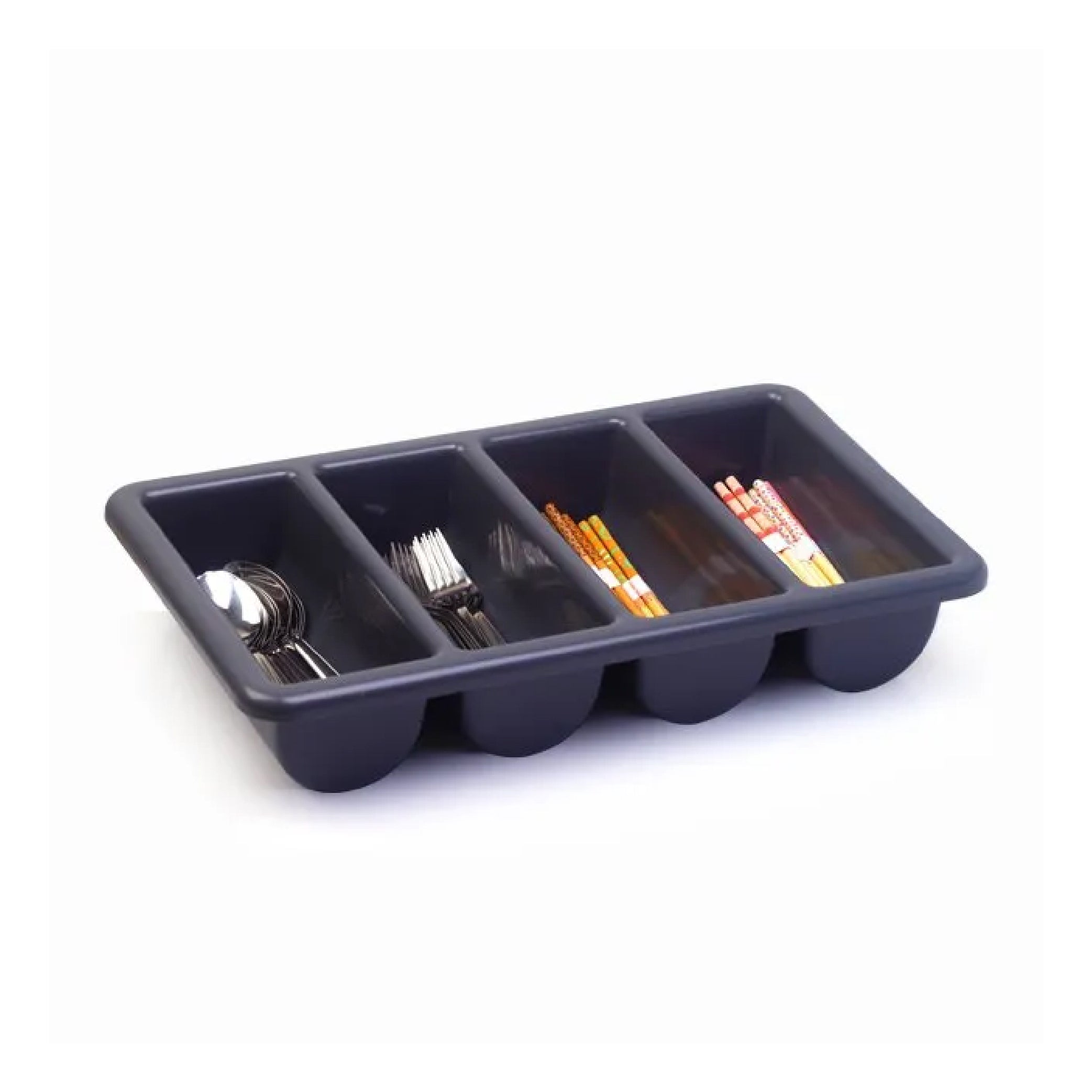 Allowing you to keep an organised kitchen at all times, our Cutlery Tray in Black Plastic provides dedicated slots for each item of cutlery. Made from a strong and durable plastic, the tray is sized specifically to fit in most types of kitchen draw and features four concave compartments for your forks, knifes, spoons and teaspoons. Easily wiped clean and sanitised when needed, these cutlery trays can also be displayed out during dinner time to effectively allow diners to equip themselves. When empty, the trays are fully stackable minimises the amount of space needed for storage. A durable and reliable addition to busy canteens or kitchens.