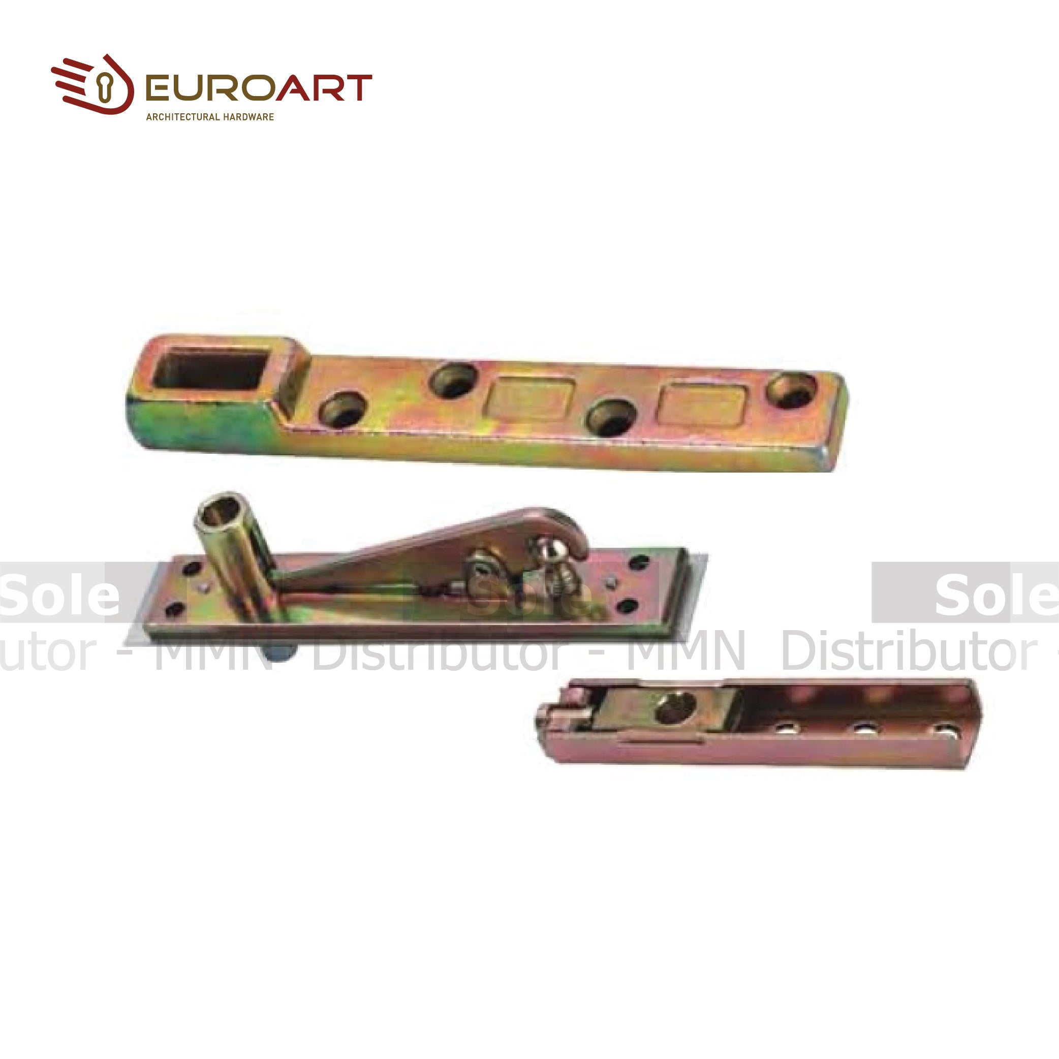 EuroArt Reversible Bottom Arm & Top Pivot: Durable steel hardware for double action doors. Easy installation, satin finish for a modern look. Perfect for commercial or high-traffic areas.