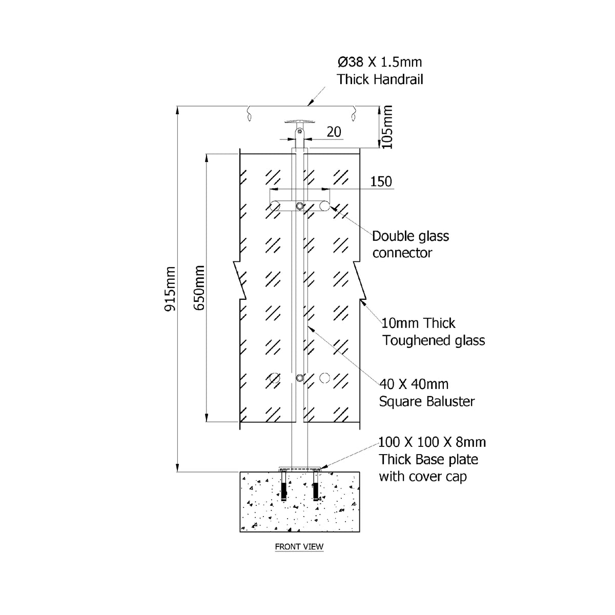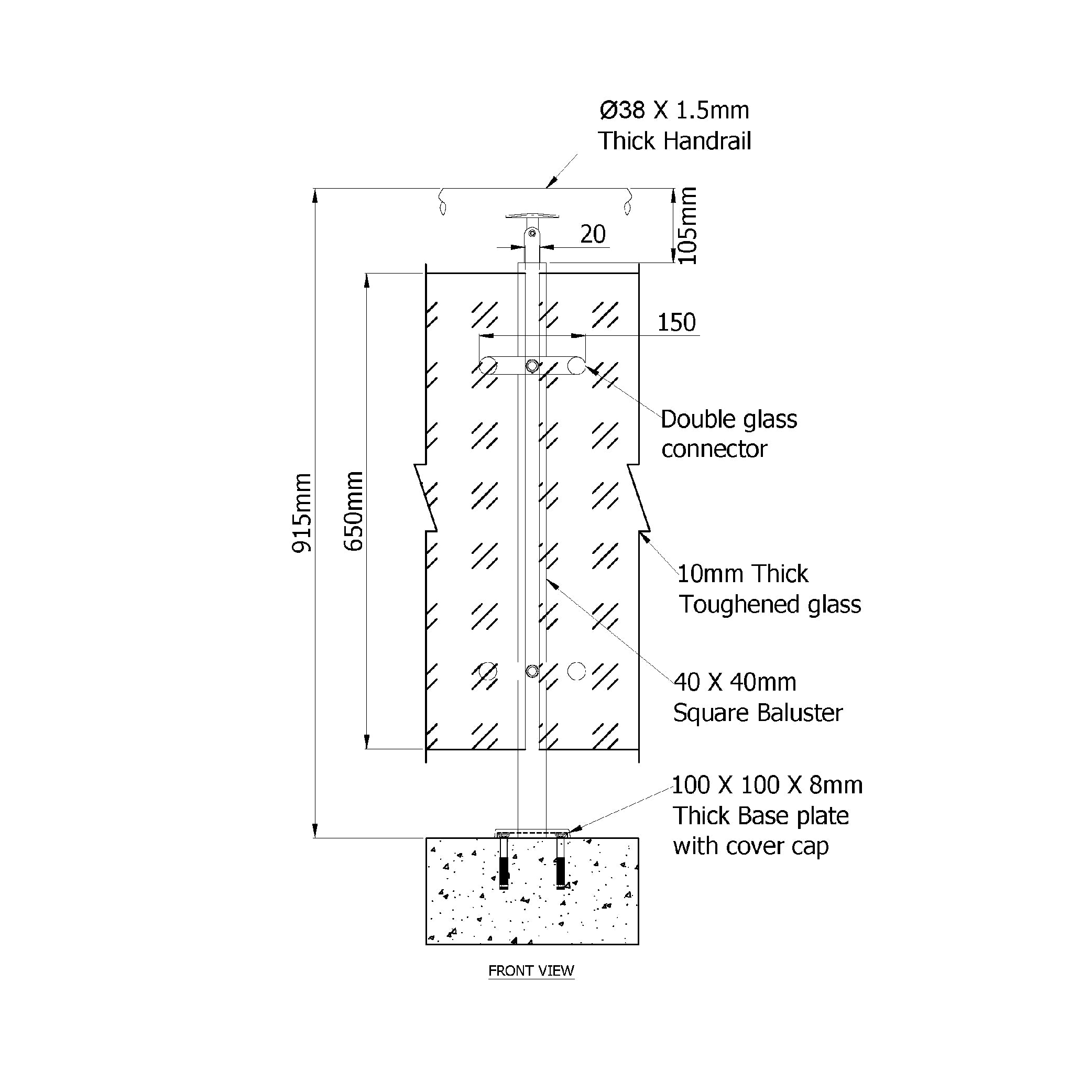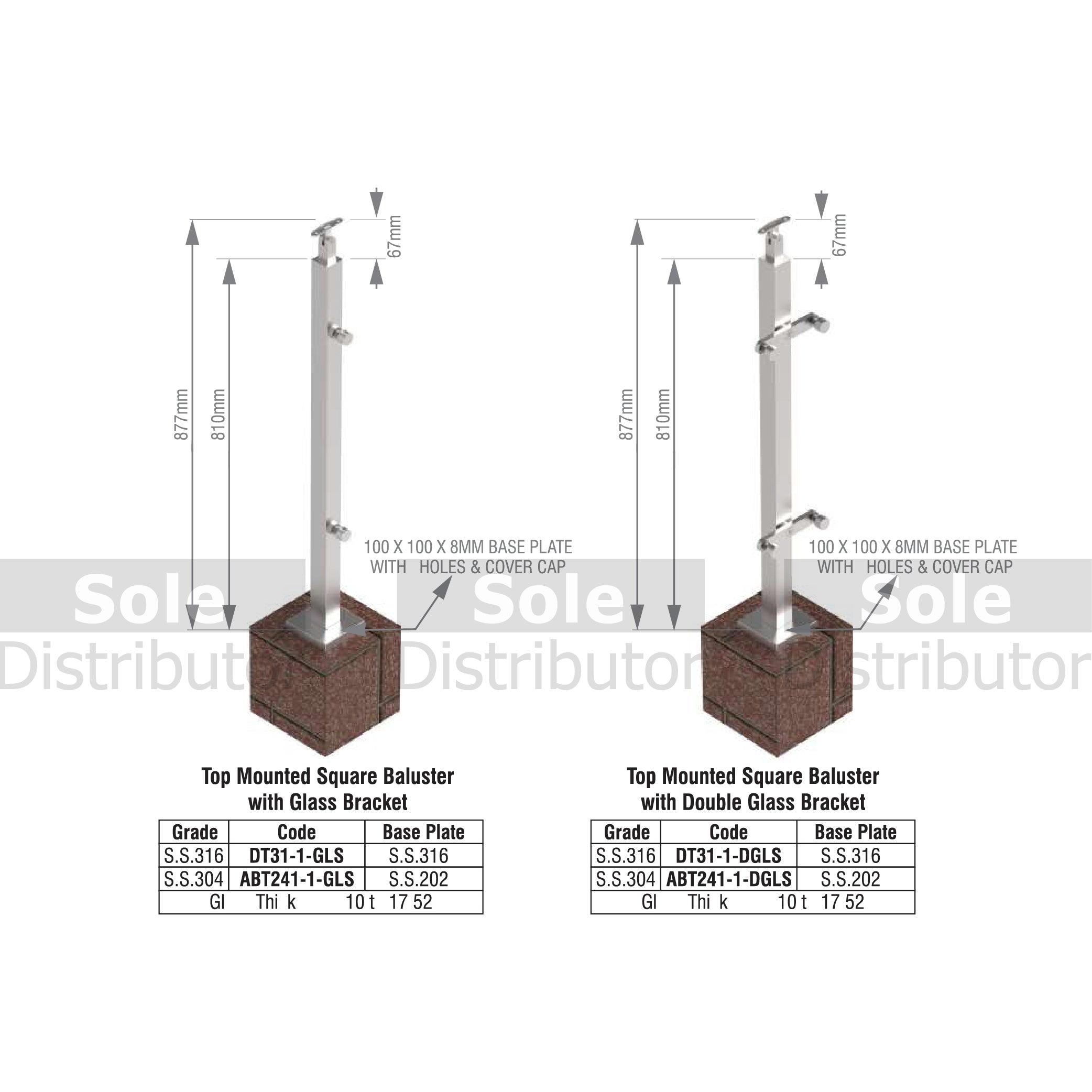 Kich Handrail Top Mounted Square Baluster System With Double Glass Bracket Stainless Steel 316 Grade - DT31-1-GLS