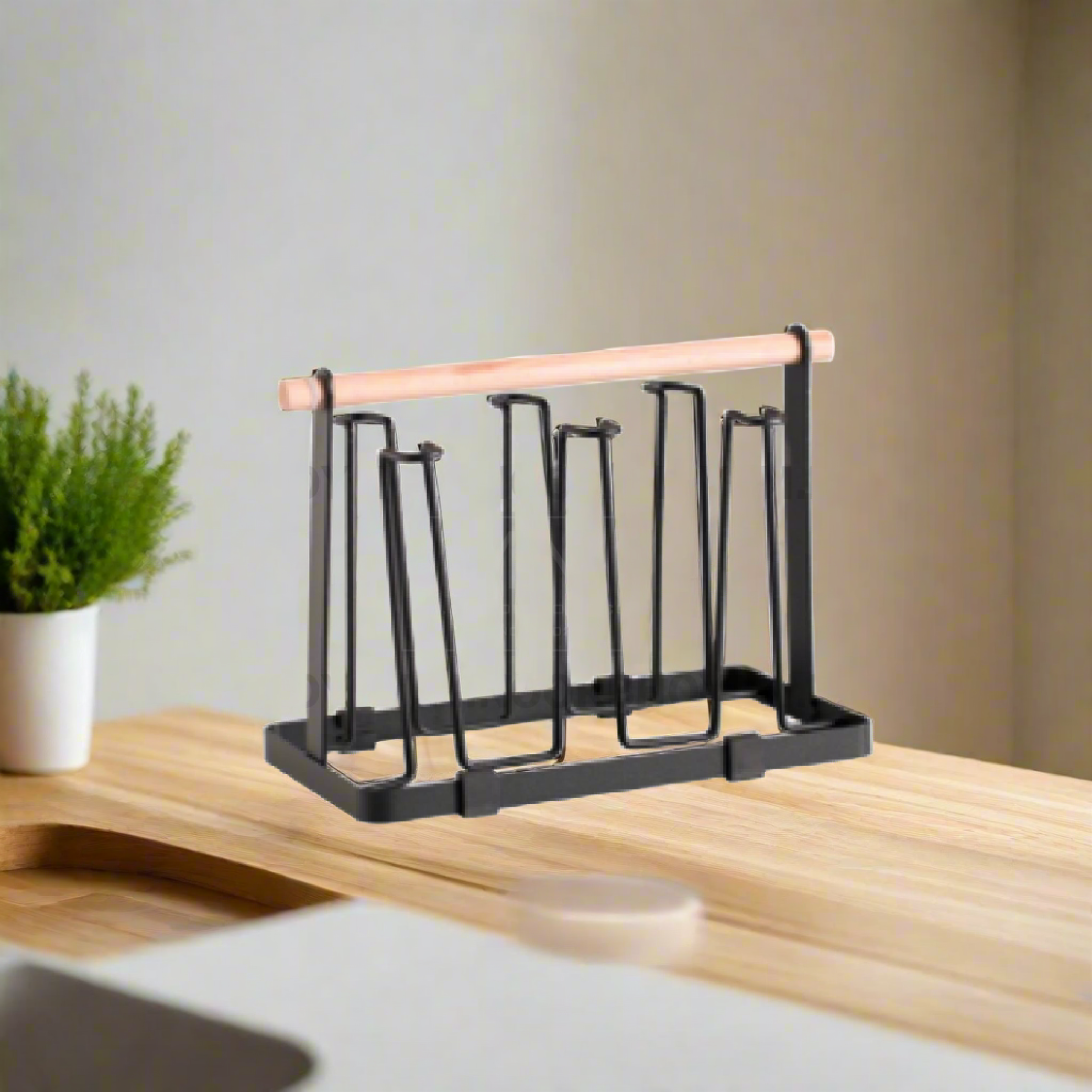 Mcoco's Black Steel Cup Drying Rack with a wooden handle adds modern flair to kitchen organization. Stylish and practical, it keeps cups in order with ease.
