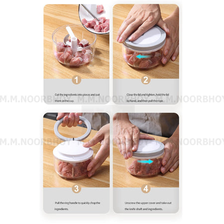 - Fast Cutting - The stainless steel blade of the S-shaped three-dimensional rotary knife surrounds the upper, middle, and lower areas like a whirlwind and, at the same time, scientifically tilts up by 30 degrees to ensure that all ingredients can be chopped evenly. Pull the rope once and the blade rotates 7 times at high speed, which is equivalent to cutting 22 times with a traditional knife. The specially designed big pull ring allows you to use it more effectively.