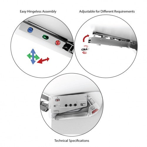 D-Lite Lift’s 3-dimensional alignment mechanism which offers adjustment of up-down, left-right, back-forward for flawless installation. The lift-up force of the mechanism can be adjusted according to door weight and height. There are 3 different D-Lite Lift mechanism alternatives for different door weights which provides sleek solutions to designers in a wide range of door sizes.