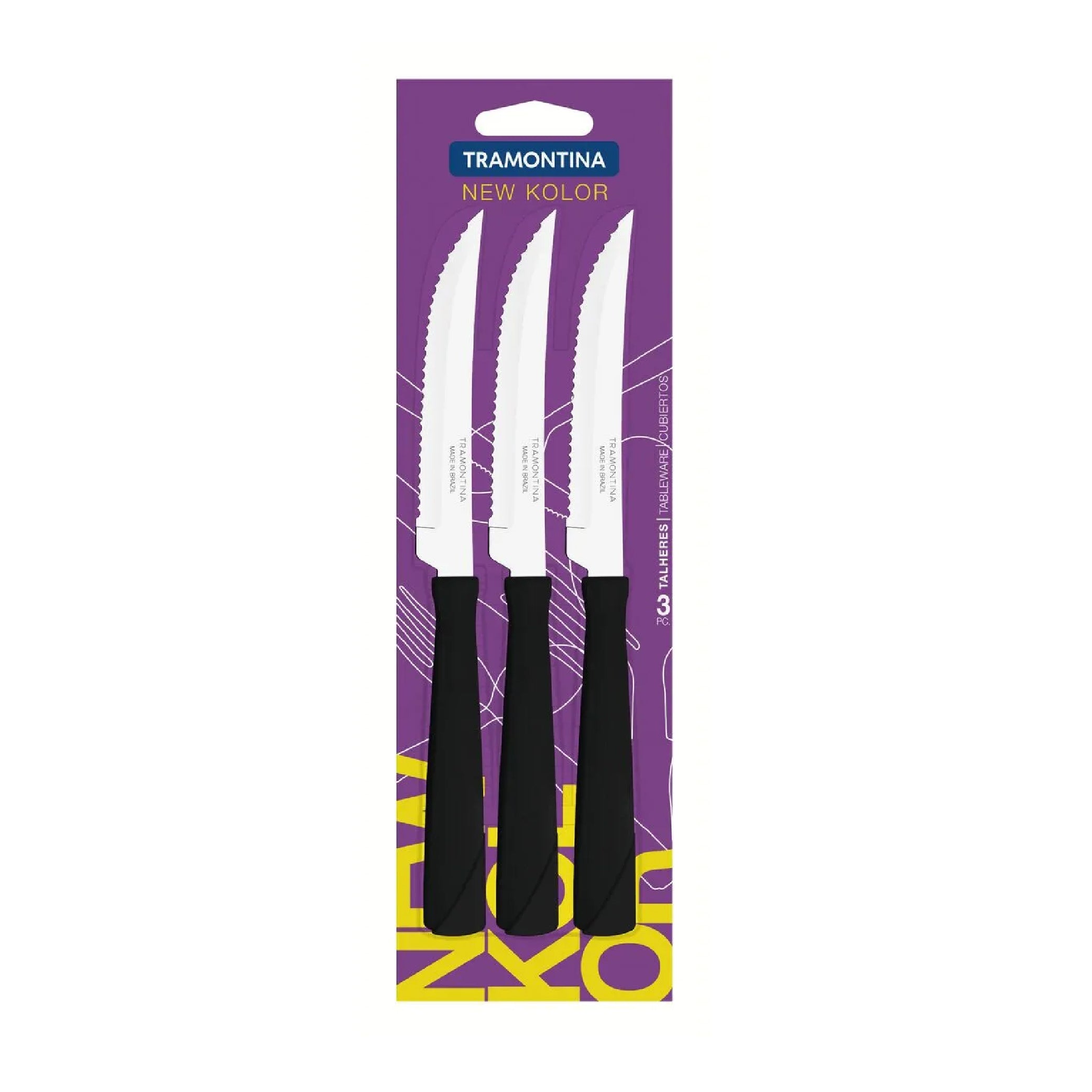 Tramontina's 3-piece Kolor Steak Knife Set features durable, colorful polypropylene handles and highly-resistant stainless steel blades. Thermal treated for a longer-lasting cutting edge, these knives are made to last and are dishwasher-safe for easy cleanup. With this set, you can easily add a splash of color to your dining table.