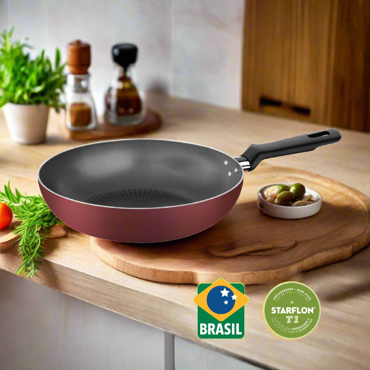 | 2.0-mm thick aluminum body for faster and more uniform cooking. Interior and exterior Starflon T1 non-stick coating. The only one with T technology: better non-stick properties, greater scratch resistance, increased durability, easier to clean, and PFOA-free for scratch resistance lasting for more than 5,000 cycles of use in compliance with Brazilian standard ABNT NBR 15321:2013. The heat-resistant Bakelite handle offers increased safety during use. Dishwasher safe to make your daily routine easier.