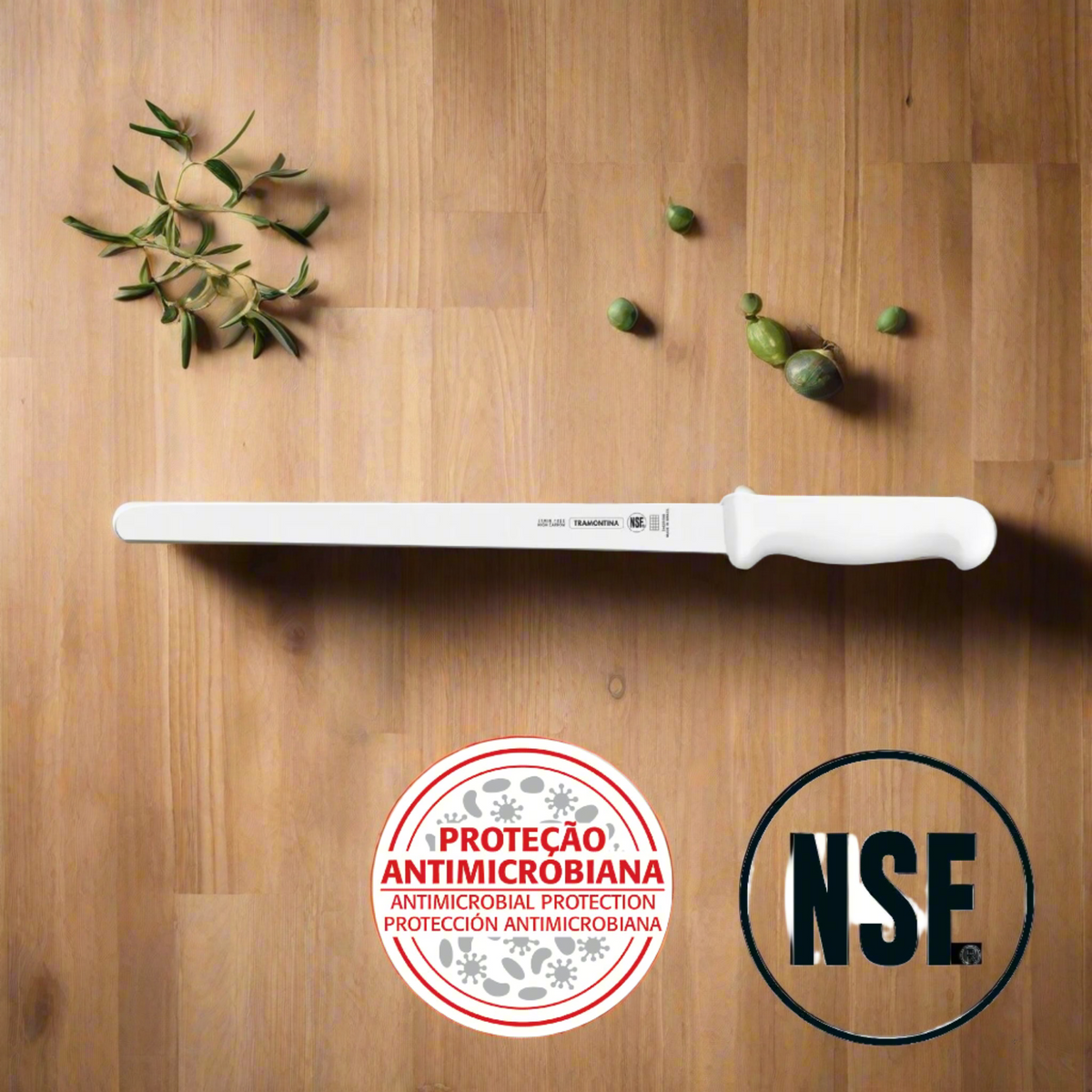 Experience premium performance and durability with the Tramontina Ham Slicer 16 Inches. Crafted with cutting-edge technology and a thermal process to harden, cool and temper the blade, it accurately delivers precise and consistent results. The ergonomic and textured handle with antimicrobial protection provides a secure grip and reduces the growth of bacteria and fungi.