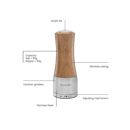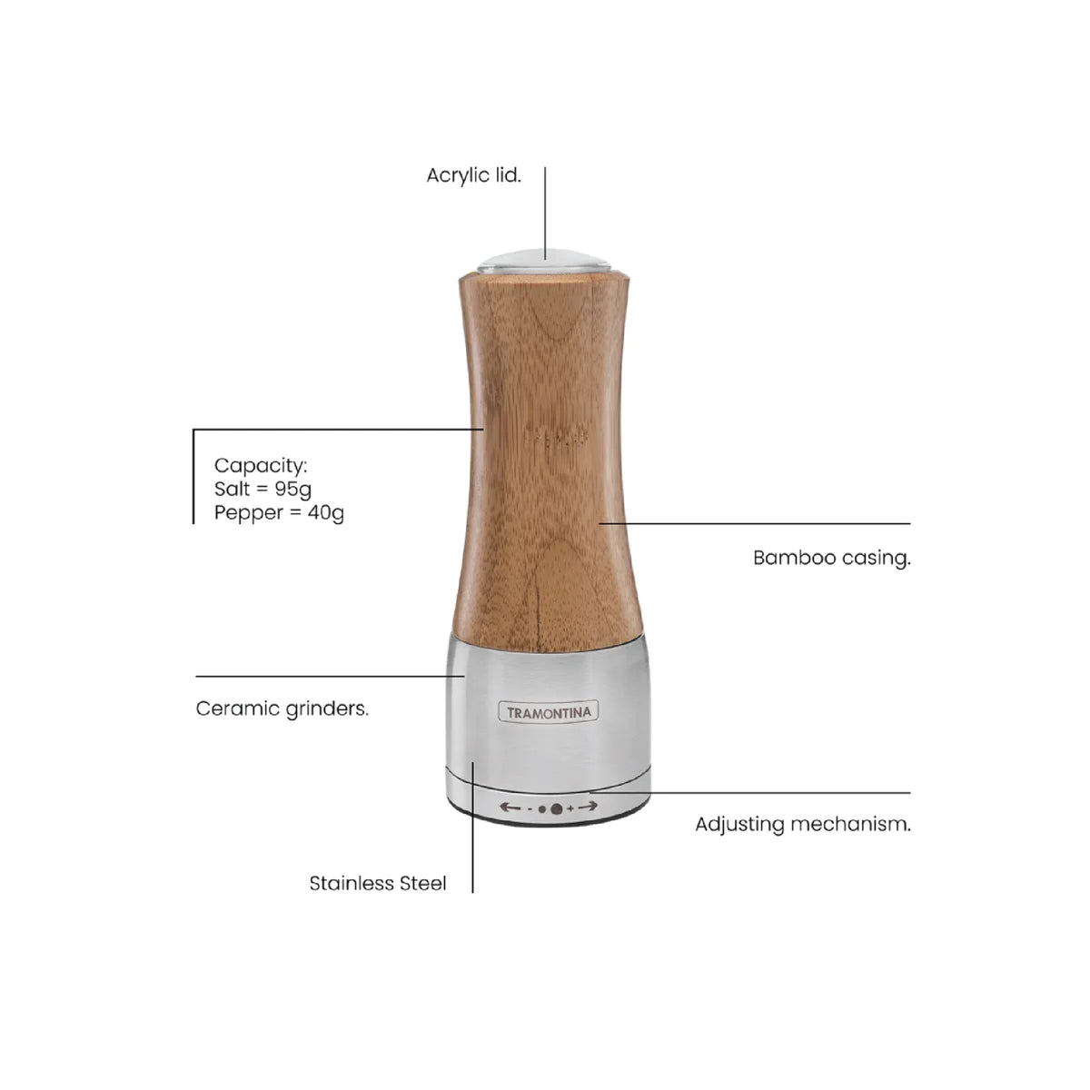| Main Functions and Benefits | Practical and elegant! Highly resistant and long-lasting gears. With grinding adjustment, grind size adjustment to suit your taste. Provides hygiene and elegance. Material: Bamboo + Stainless Steel Ceramic grinders. Bamboo casing. Acrylic lid. Capacity: Salt = 95G Pepper = 40G |