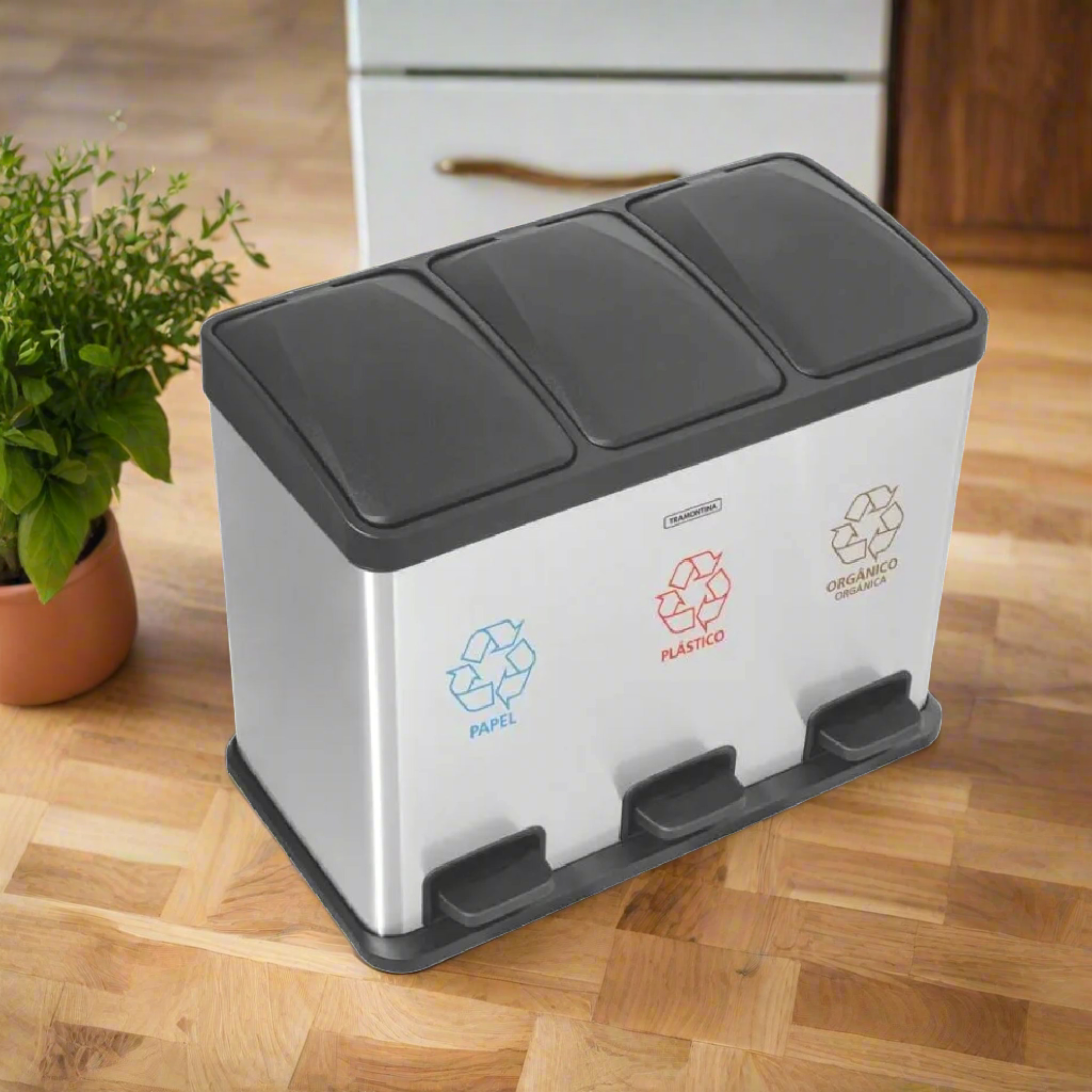 The Tramontina Triple Tramp with Pedal<-strong> has an innovative design providing better use in the corners of the house. Perfect for spaces with large public circulation and environments that need cleaning and refinement. Manufactured in stainless steel with a thickness of 05mm that guarantees the durability and quality of the product for much longer, even with constant use, the garbage can will always remain resistant. It has a scotch brite finish with an anti-digital treatment preventing stains. In addition, it comes with a removable internal bucket and stickers for selective collection.