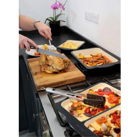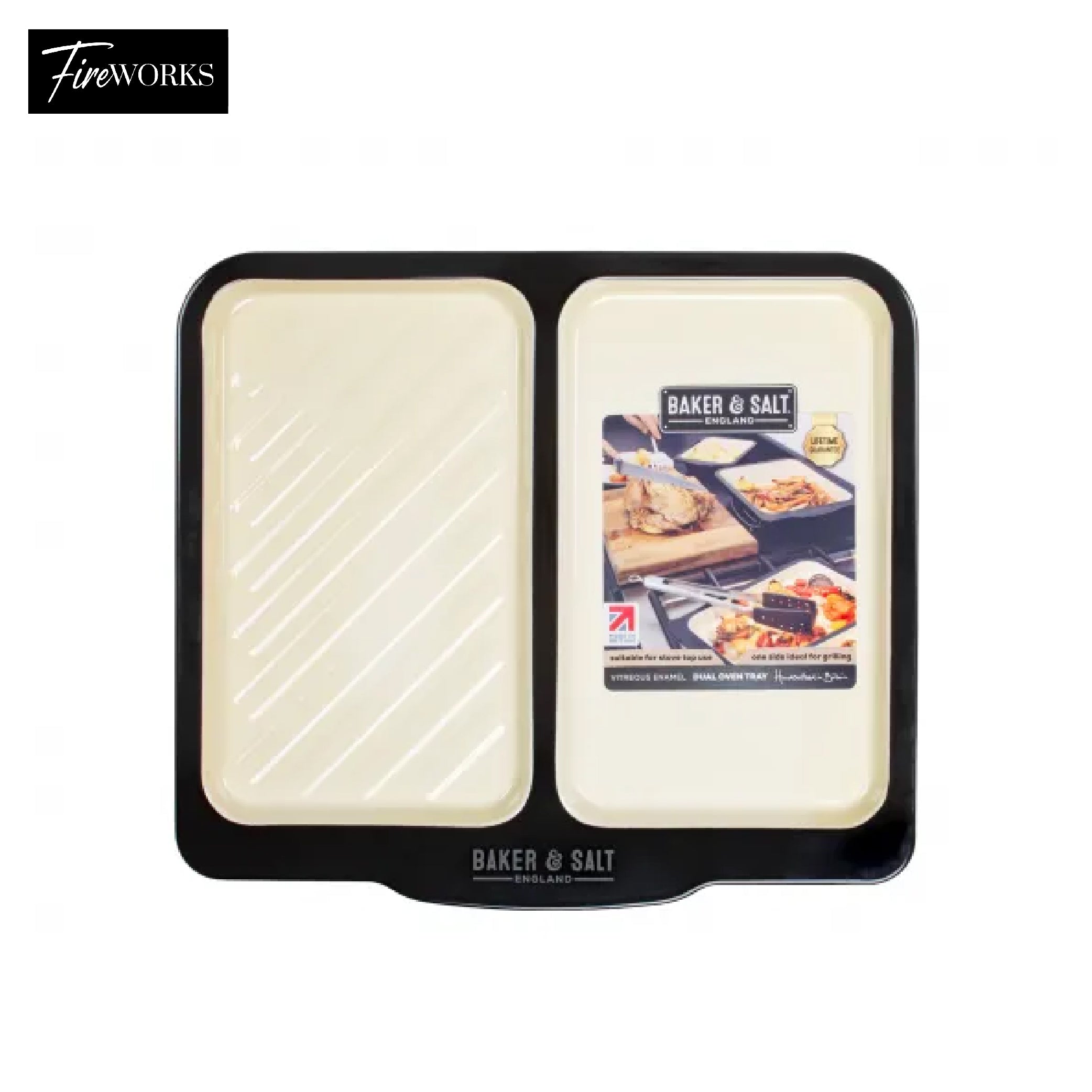 Large Dual Tray. Enamel, heavy weight base steel, creates the sturdy structure of these high quality tins. Suitable for oven, stove top, induction,grilling in BBQ or any naked flame. They are suitable to use with metal utensils. Handcrafted in Britain.